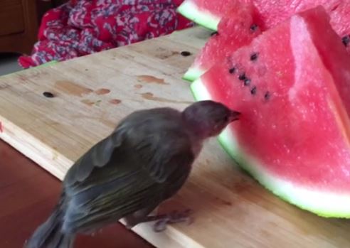 发布时间:2017-07-26 17:59:37随着夏季的到来,胡女士发现,小鸟对西瓜十分痴迷,几乎每天都要吃。