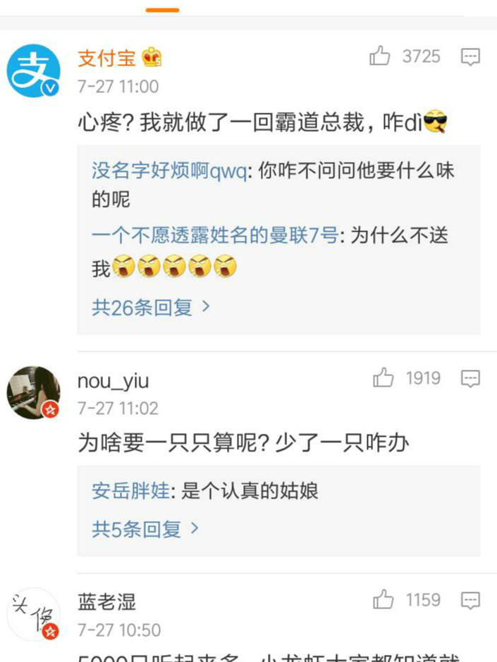 网友们纷纷心疼重庆美女吃不完5000只小龙虾的时候,支付宝霸气回应:“心疼?我就做了一回霸道总裁,咋滴”。