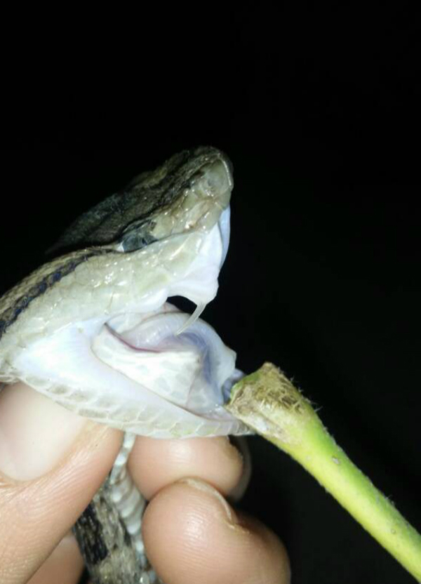 该男子把蛇嘴弄开,我们可以从图片中看到它尖尖的,半透明的牙齿,十分锋利。