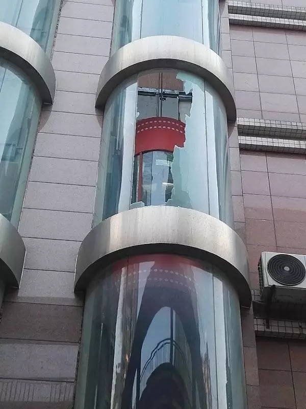 抬头一看,才发现是三楼观光电梯的外围玻璃炸裂了。而此时炸裂的玻璃,还有一部分仍在观光电梯外围的玻璃框上,时不时地往下掉。