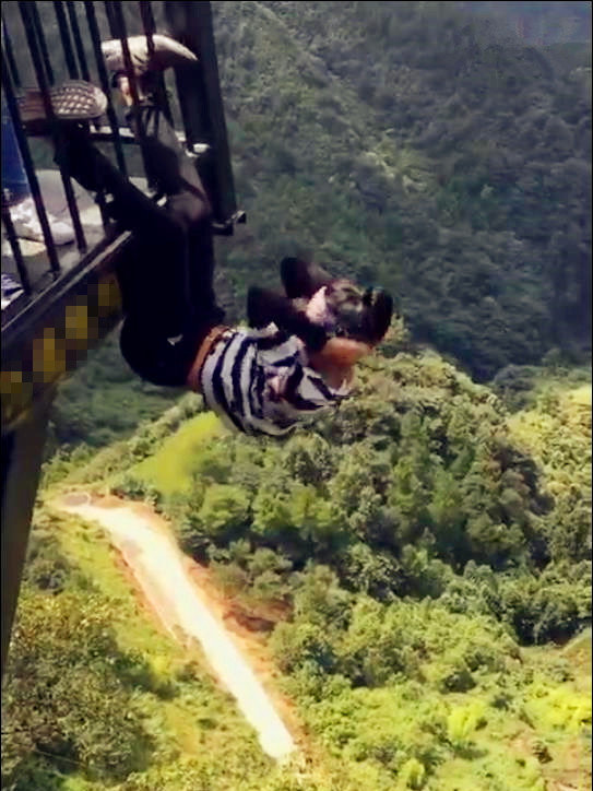 目测一个二十出头的小伙,在悬空千米的天悬廊桥外围处炫技。他时而做仰卧起坐,时而做引体向上,时而做俯卧撑。
