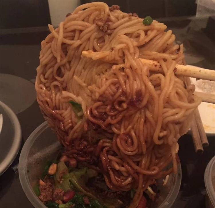 直到晚上23点,外卖员送来了小申下单的小面。小申一打开饭盒发现,好好一碗小面都成面饼了,真是笑哭了自己。