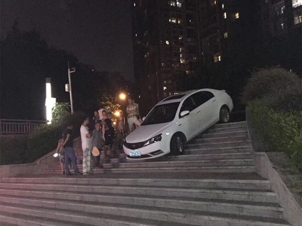 司机说自己是跟着导航走的,从路口转过来,来不及仔细看,也来不及踩刹车了,就顺着楼梯滑了下来。
