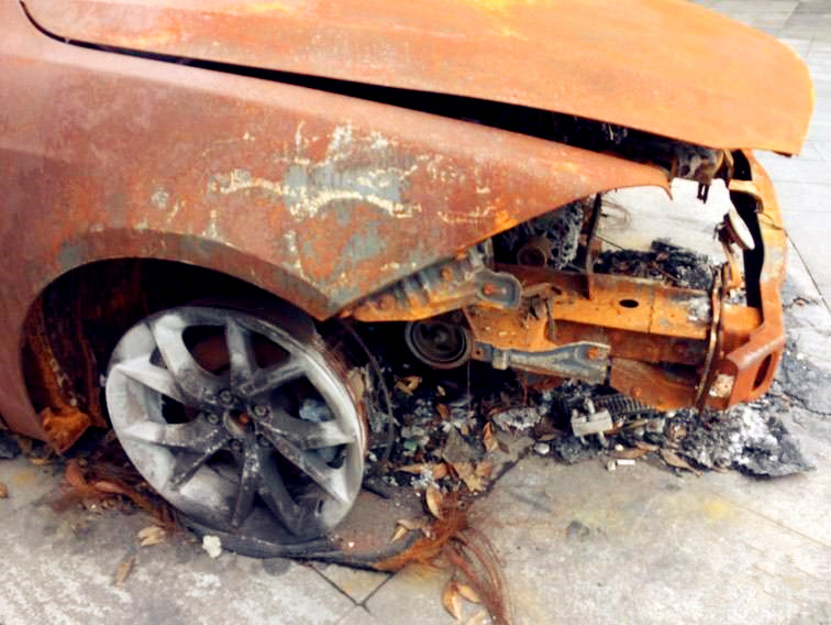 车身有火烧的痕迹,前后四个车轮都有不同程度的损毁。