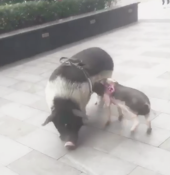 重庆一夫妇街头遛2只猪和2只狗 画面逗趣引围观
