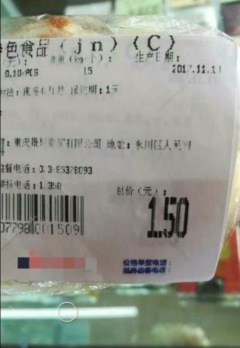 小肖介绍称:11月13日,在永川某超市买了一个饼,第二天早上吃了一大半后,发现饼子的价格标签比较厚,仔细一看,竟然有两个标签。
