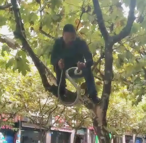 路边树上盘踞大蛇 输液男拔掉针头上树抓大蛇