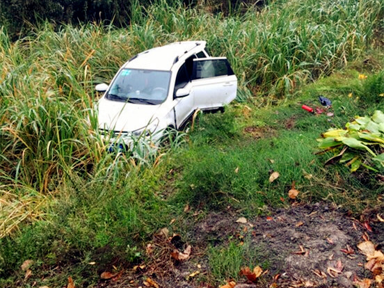 从道路上滑下农田的这辆白色小车,是一辆白色SUV,后座车门已经开启。