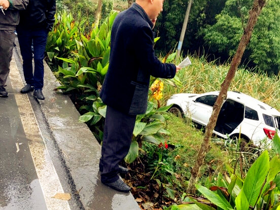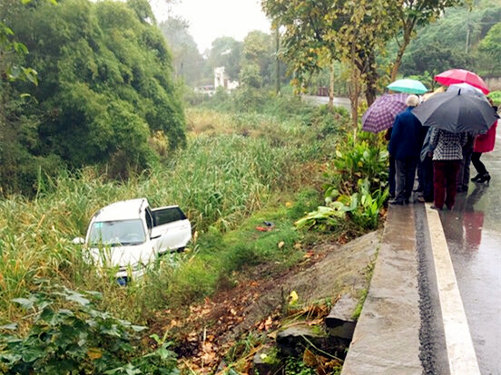 在事故现场,已经陆续围拢来了一些村民,撑着雨伞在了解情况,当时天正下着雨,路面湿滑。