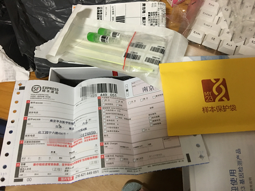 拿到包裹后,章女士仔细看了包裹上面的寄件人和地址,南京一个医药研究所寄过来的,寄件人她也不认识。包裹的下面,还用黑色加粗的字体写着几个大字:基因检测卡。
