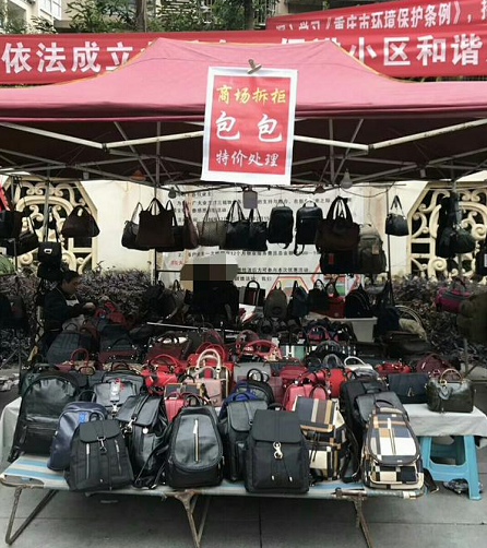 每个棚下都卖着各式各样的商品,在一个卖皮包的摊位上,商品放在用大小不一的桌椅板凳拼起来的台面上,在棚顶还挂着“特价包包”广告标语。