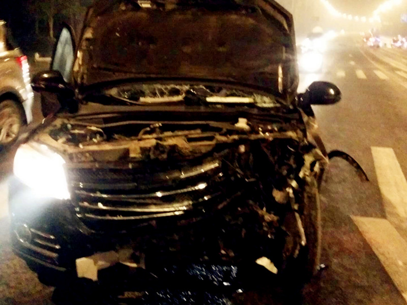在现场的另外一辆私家车,车头已经严重变形,左大灯已经不见了踪影,车头左侧凹陷严重,保险杠已经损毁。