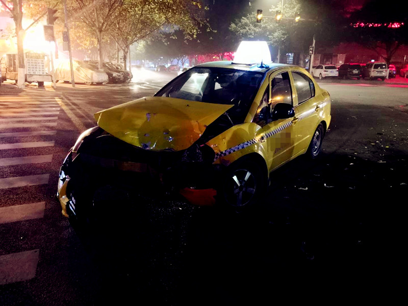 另外一辆出租车损毁比较严重,整个车头已经完全变形,引擎盖被撞到掀起,保险框已经被撞断并拖地。引擎盖内的发动机及周边零配件也有被撞坏的痕迹,地上散落着不少的车身残骸。