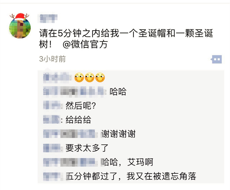 重庆时间在此提醒大家,不要再“@微信官方”了,因为你的圣诞帽不会自动出来的。