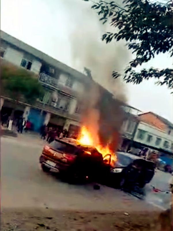 发布时间:2018-02-22 11:57:132018年2月16日重庆合川,当地居民看到一辆面包车与一辆SUV相撞后,当街燃烧起火。