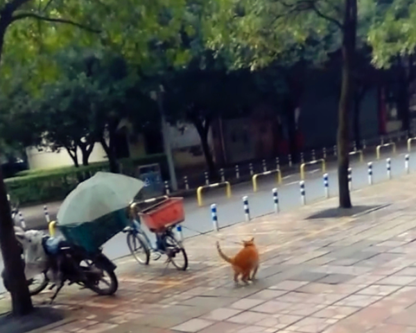 本来橘猫是不打算搭理小黄狗的,可小黄狗一直在橘猫跟前晃悠,橘猫被惹怒后奋起追小黄狗,可被套在脖子上的绳子给弹回来了。巨大的力气将摩托车都拉得摇晃起来,橘猫无法挣脱绳子的束缚,不得已,只能呆在原地。