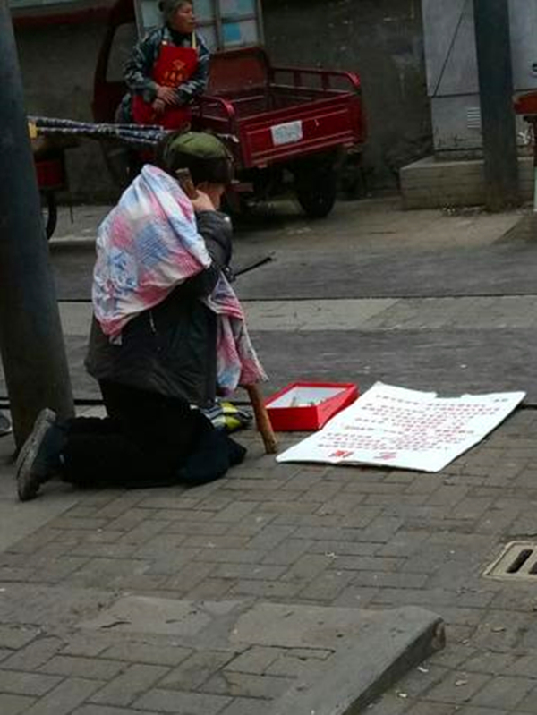 老人身披薄毯跪地乞讨 路人投钱后他这样说