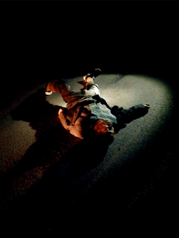 因为事发突然,现场道路光线昏暗,只见一男子躺倒在地,脚上穿着一双黑色白底运动休闲鞋,下身穿着一条浅色休闲裤,上身穿着毛衣打底衬衣,披着一个大衣外挂。