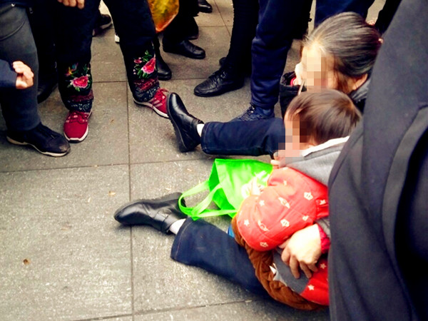 大妈一直带着孙娃,坐在地上情绪一直不能平静,引得市民陆续前往围观。