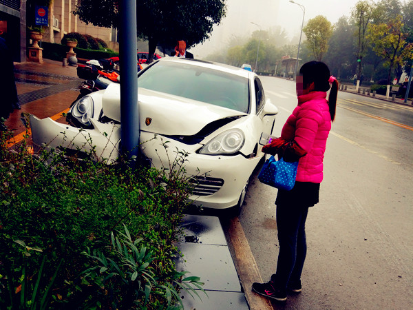 保时捷撞上路边电杆 车头凹陷严重变形