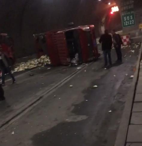 货车隧道中侧翻 车内萝卜散落一地