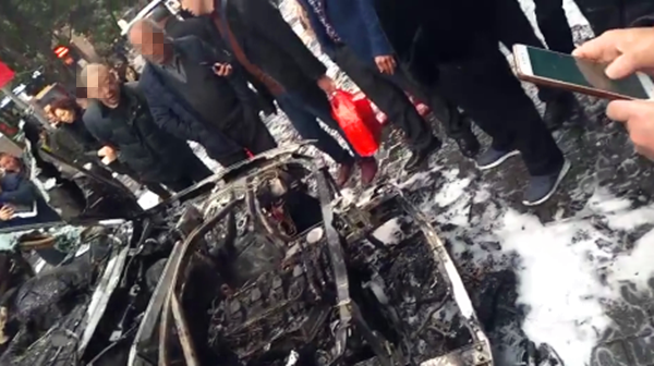 大火被扑灭,但奥迪车已经被烧成“空架子”,面目全非,只剩下一副漆黑的铁架子。