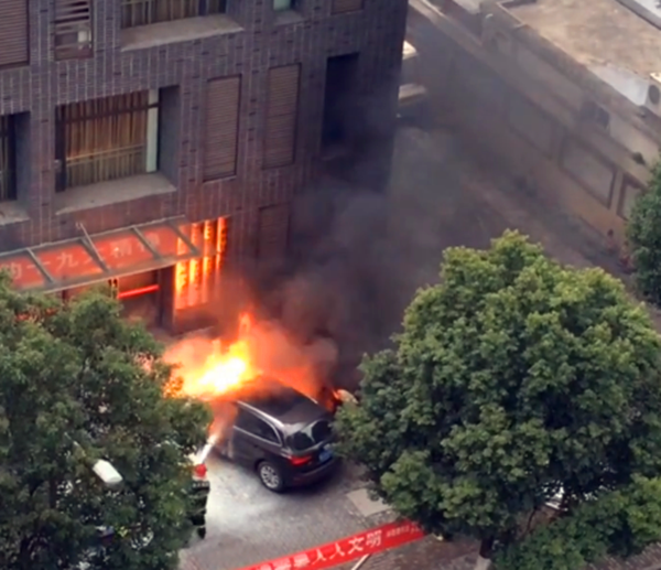 现场我们可以看到,奥迪车的整个车身瞬间被火焰吞噬,火势越来越大,向周围四处蔓延。