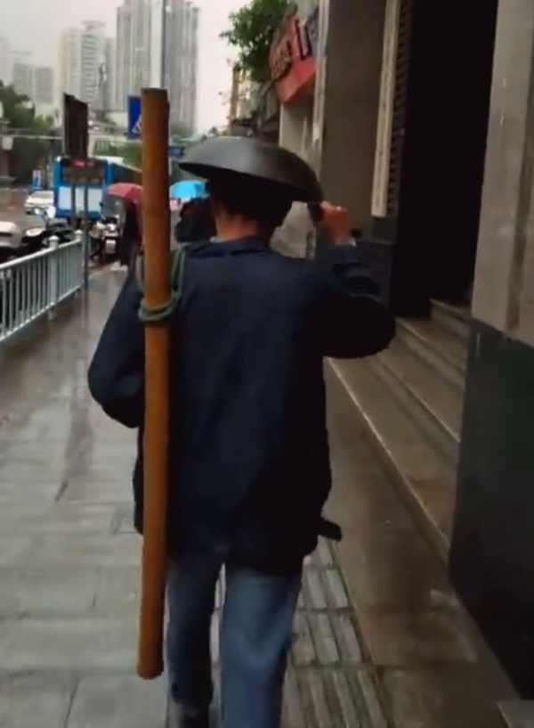 男子穿着一身黑色上衣,一双布鞋,原本朴素的造型却因为头顶的铁锅,多了几分新意。男子一手握住拴着竹棒的麻绳,一手举着铁锅的把手,让锅口扣在脑袋上遮雨。