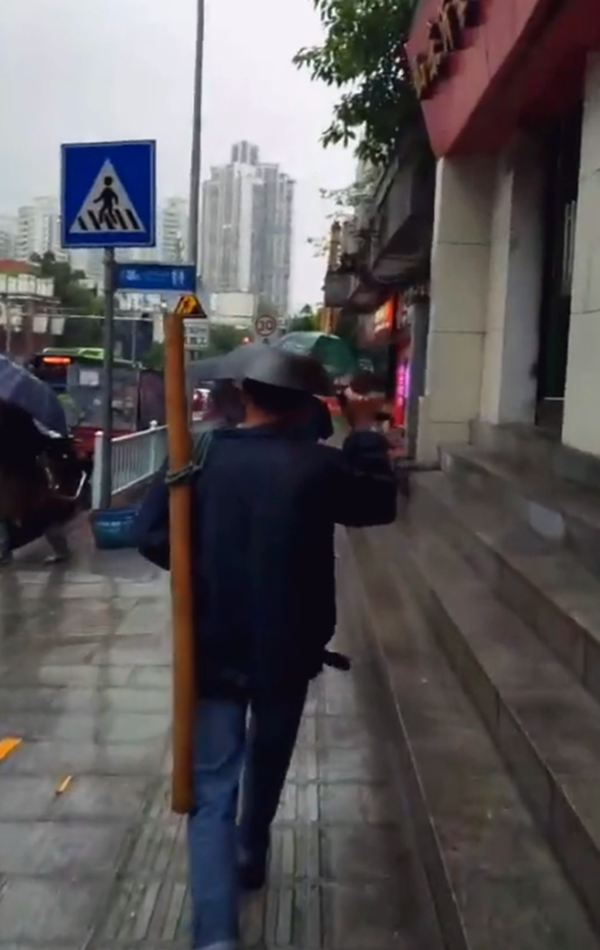 来来往往的路人都撑着雨伞,看见男子的造型,忍不住回眸。“这么大的雨,男子还出来接业务,实在是敬业”,一旁正在躲雨的市民一边感叹,一边将男子顶锅行走的画面记录下来。