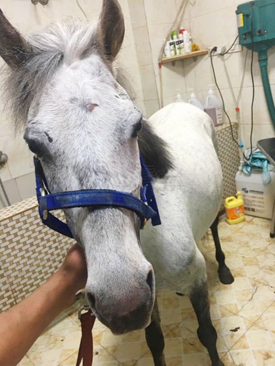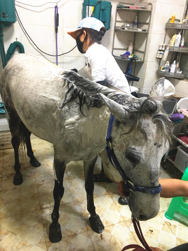 这只宠物马今年有6岁了,马主人见马毛上有灰尘,就将它带到宠物店进行洗澡保养。