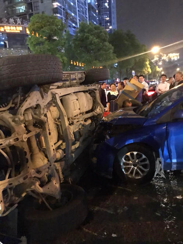 两私家车十字路口相撞 一车呈90度侧翻于地面