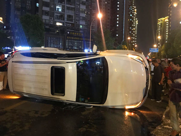 白色私家车被撞翻,呈90度侧翻垂直于地面,车上零件脱落,反光镜碎裂,现场一片狼藉。