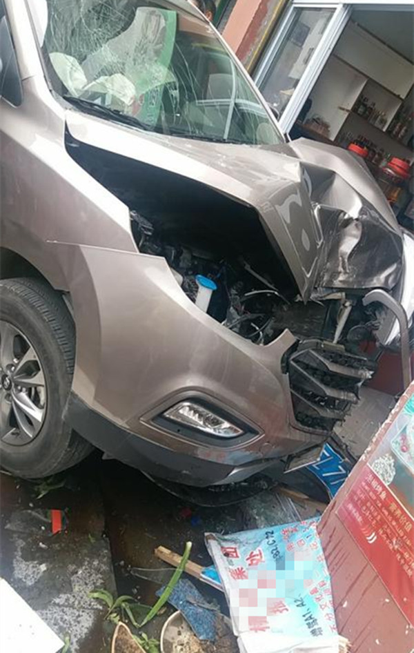 车子失控冲进餐馆 玻璃门窗碎一地