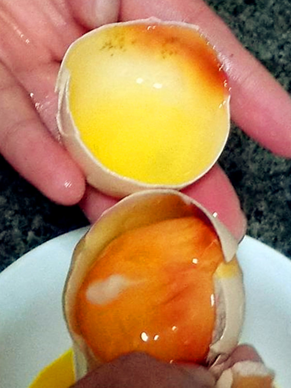 从蛋壳的情况来看也还好,但打开后就可以发现色泽不对,还有一股异味不太好描述它的味道。爆料网友说:“看着都觉得糟心,也不知道为啥当时自己没注意,太坑人了这些商家。”