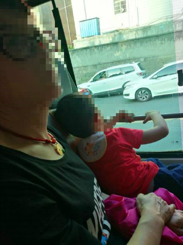 一位戴眼镜的大妈,安然舒适的坐在位置上,眼睛一直望着身边的小孩。而这位小孩,看去年龄不大,大概在3岁左右,在车内不停的变化坐姿,一会盘腿而坐,一会用脚踩着座位的后背,浑身不自在。