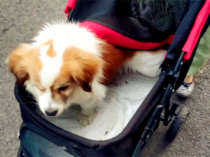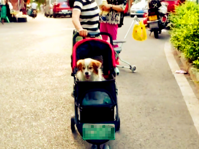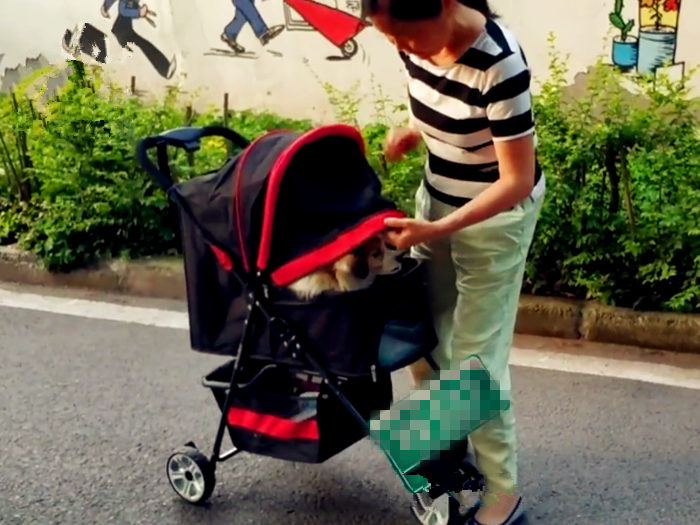 女子推“婴儿车”遛狗 画风温馨引路人张望