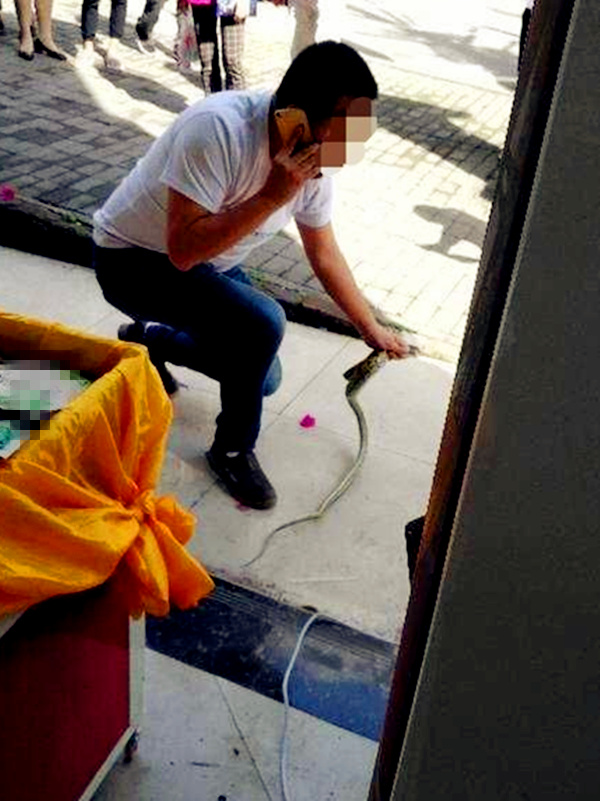 不一会儿,现场围满了路人,大伙纷纷掏出手机,拍下男子捉蛇的画面。