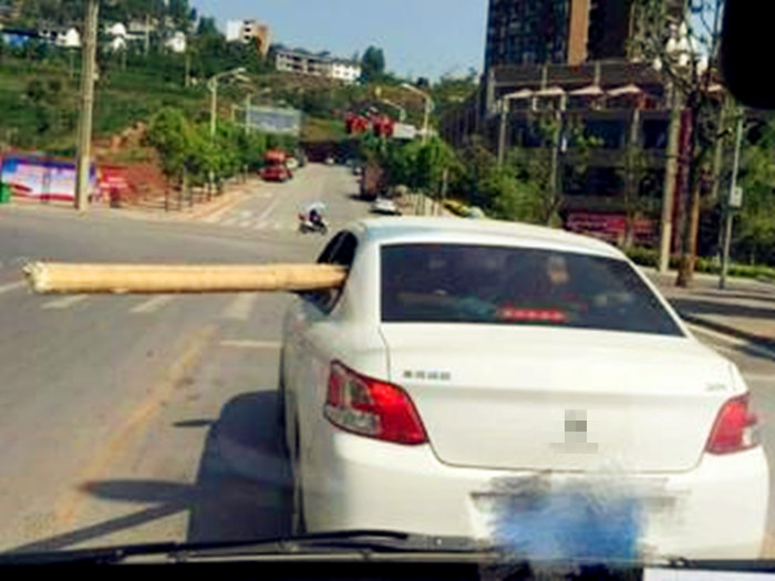 木棍横穿车内造型吸睛 这样上路“太危险”