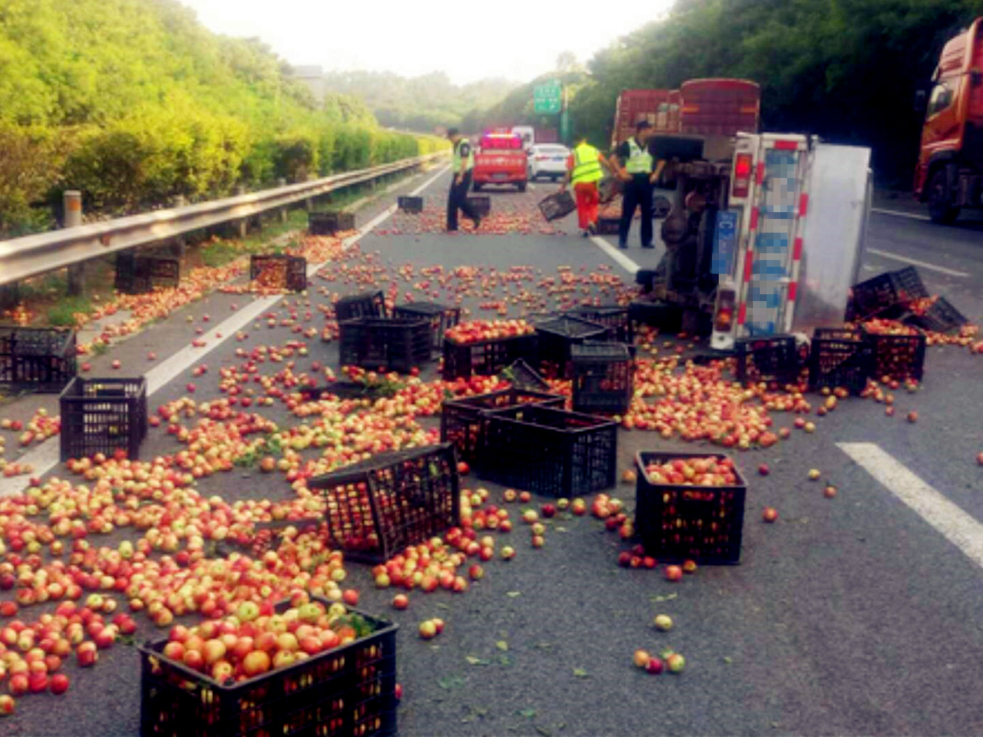 经了解,事发前货车右后轮发生爆胎,造成车辆失衡后侧翻,车上装载着的桃子瞬间倾倒占满整车道。