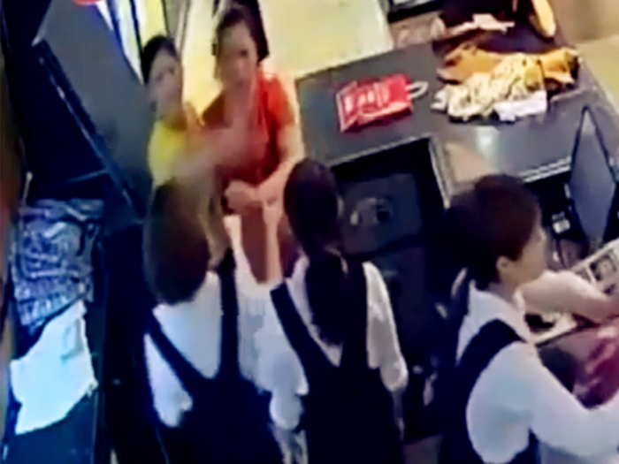 通过监控可见,当时张女士3人气势汹汹在收银台附近与店员进行沟通,其中一名女子已经挡在了收银台门口,有店员要求女子离开,但沟通无效随即双方发生抓扯。