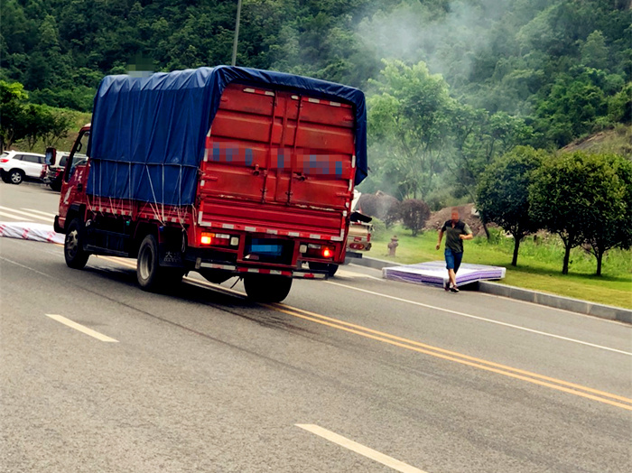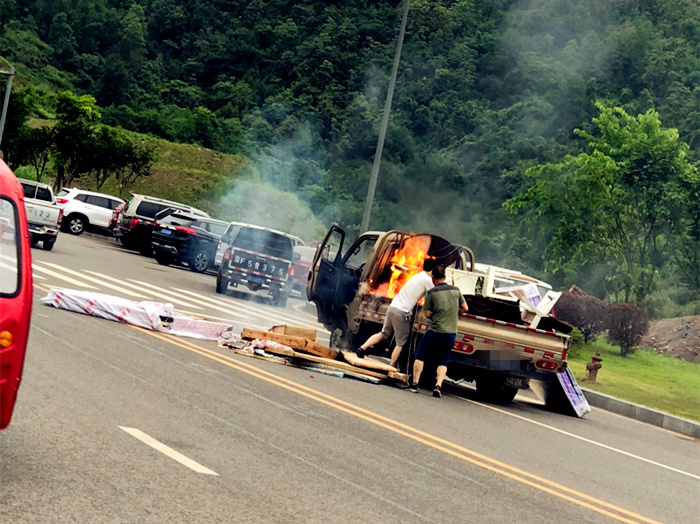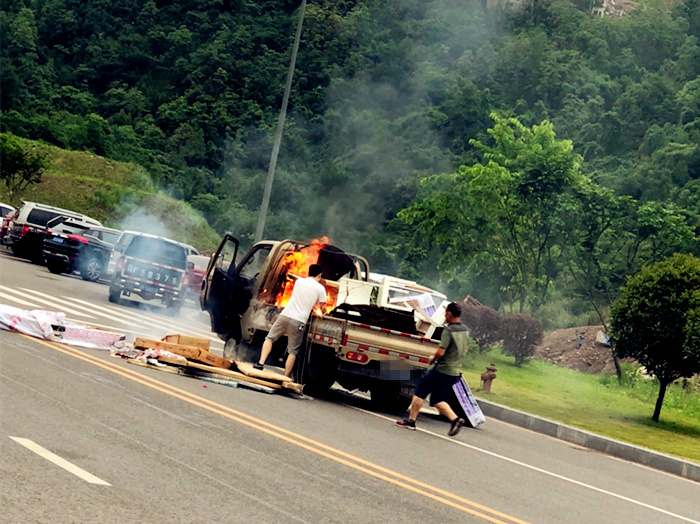 从爆料网友提供的图片来看:小货车上不断冒出明火,火势剧增,车内的部分家具被殃及。