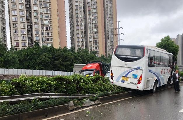 发布时间:2018-05-23 12:35:392018年5月23日,有网友爆料称,在成渝高速路靠近陈家坪的方向附近,发生一起交通事故,一辆大客车冲上了公路的绿化带,撞断了一棵树。