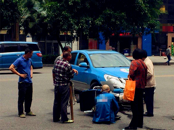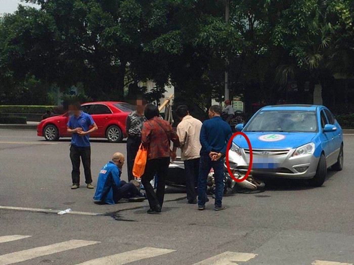骑摩托的外卖小哥与小车相撞 瘫坐在地